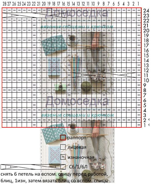 Вязать основным узором по схеме, повторяя раппорт по кругу.