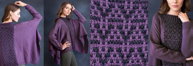 Вязаный спицами пончо-пуловер Mosaic выполняется от центральной панели с мозаичным узором к краям с рукавами реглан.