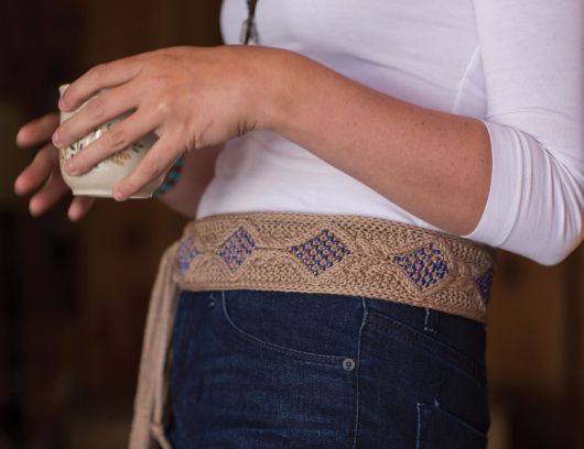 Красивый вязаный спицами пояс со шнурами Santa Fe от Joan Beebe выполнен узором из аранов с бисером.