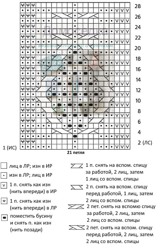 Начать в изнаночном ряду и вязать по схеме 1 и 2 ряды 1 раз, затем повторить 3-28 ряды 8 (9, 10, 11, 12) раз. После этого выполнить 3-24 ряды еще 1 раз.