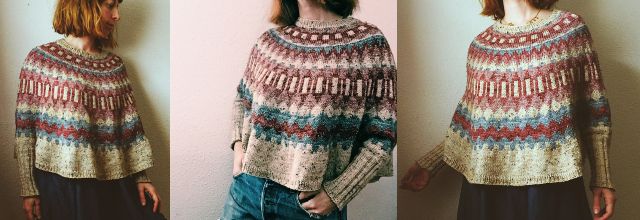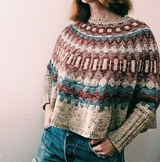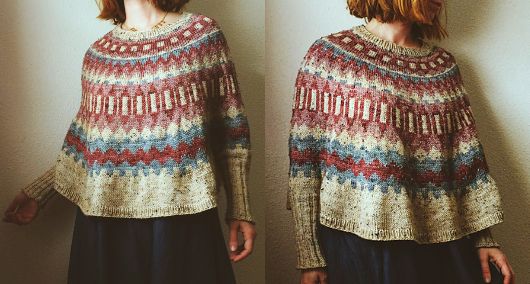 Современный и уютный вязаный свитер-пончо (свончо) выполняется сверху вниз цветным геометрическим узором. Горловина формируется укороченными рядами. Длина основной части и рукава легко регулируются.