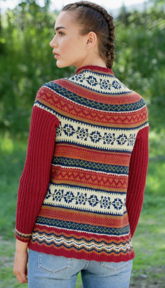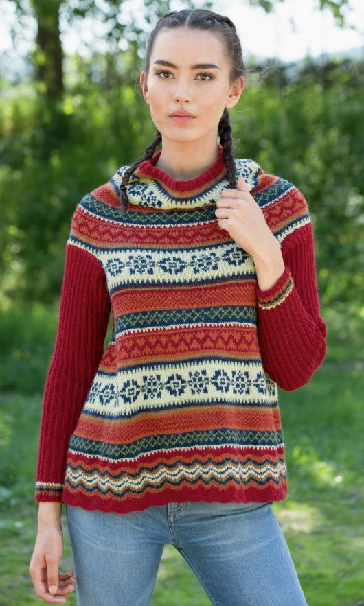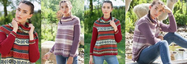 Вязаный свитер-пончо Andrea выполняется снизу вверх круговыми рядами цветным узором.