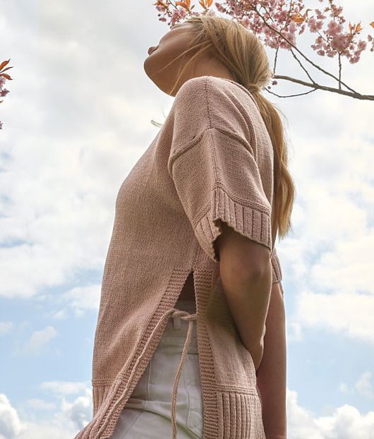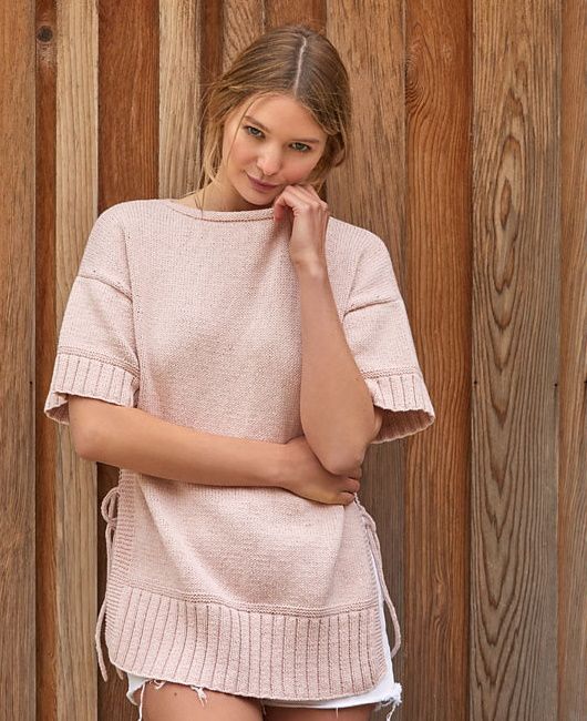Вязаный спицами свободный женский топ Blush со спущенным плечом, круглым вырезом горловины и разрезами по бокам выполнен лицевой гладью. Манжеты рукавов и планка по нижнему краю топа связаны резинкой и подчеркнуты рубчиками платочной вязки. Топ вяжется снизу вверх прямыми и обратными рядами из отдельных деталей, которые затем сшиваются вместе. Интересное дополнение – завязки на боковых разрезах топа.