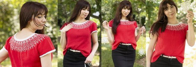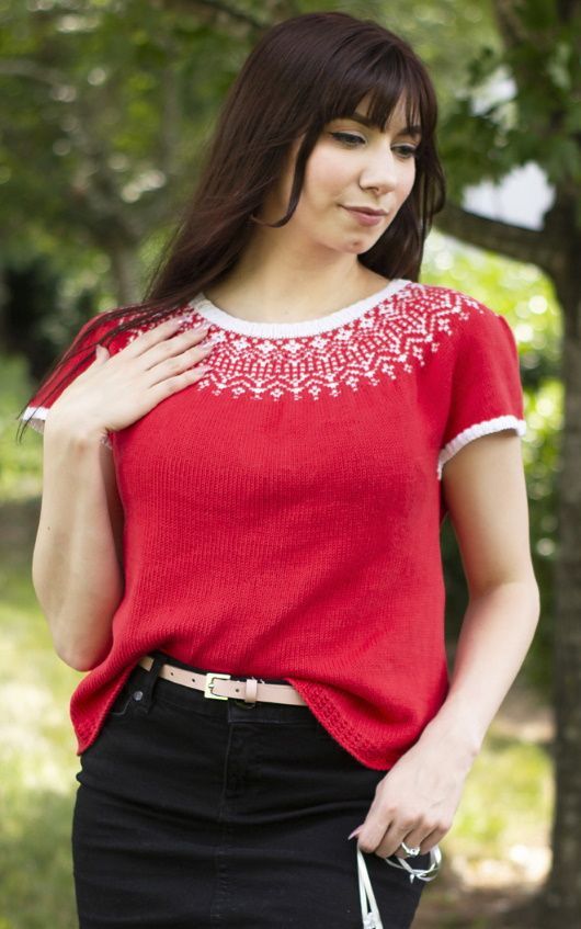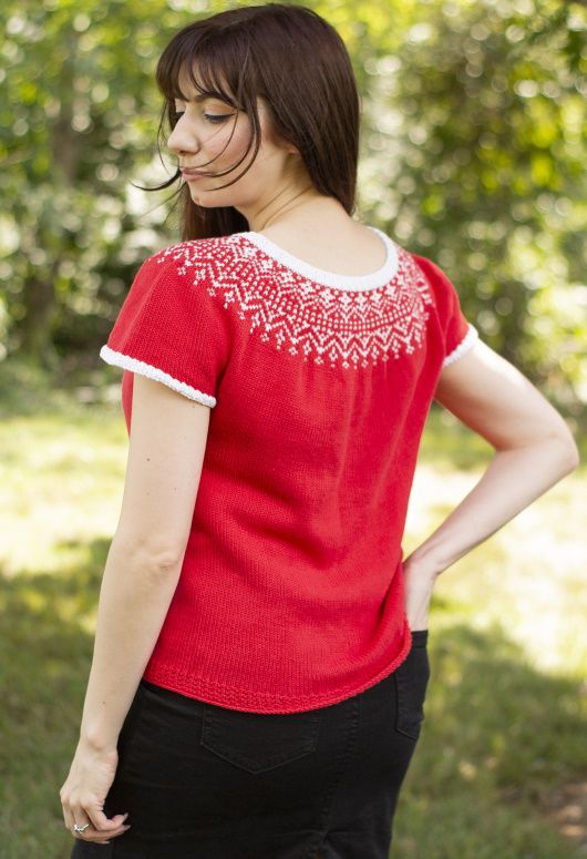 Вязаный женский топ HolidayJay для прохладных летних вечеров с короткими цельновязанными рукавами и небольшим круглым вырезом горловины. Кокетку узора украшает изящный узор из пряжи контрастного цвета. Такой же пряжей отделан вырез горловины и манжеты. Топ вяжется по кругу сверху вниз, начиная от кокетки, без швов единым полотном до проймы, затем рукава вяжутся отдельно. Когда топ будет полностью связан, по краю рукавов набираются петли для манжет, которые вяжутся резинкой.