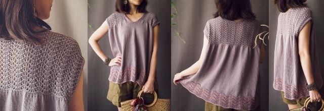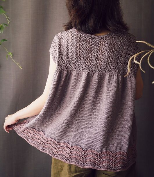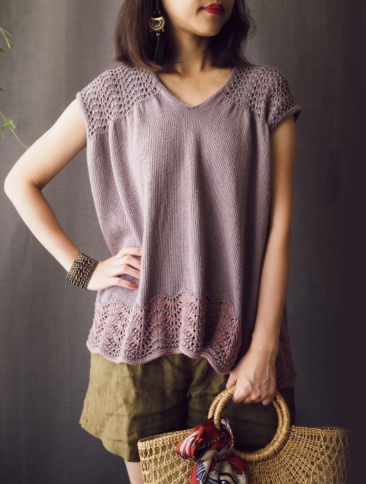 Романтичный вязаный топ Ola свободного силуэта с ажурной отделкой. Топ выполнен от верхней части спинки до плеча, затем петли отделяются для каждой полочки и вяжутся отдельно. Далее работу соединяют и вяжут прямо до проймы. Затем поднимают петли по набранному краю спинки и соединяют оставшуюся часть тела в круг.