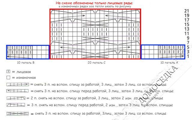 Основной узор вязать по схеме, на которой обозначены только лицевые ряды. В изнаночных рядах все петли вязать по рисунку. Повторять в высоту по 10 п. с обеих сторон ( А и В) с 1-го по 6-й р. Центральный узор повторять с 1-го по 22-й ряд.
