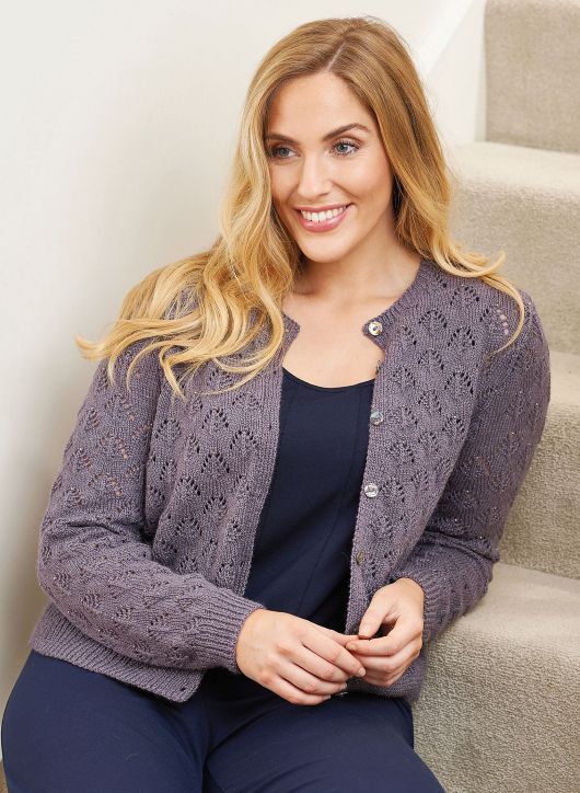 Вязаный спицами женский жакет Ashmore классической прямой формы на пуговицах, с круглым вырезом горловины и длинными вшивными рукавами выполнен нежным ажурным узором в виде сосновых веточек и украшен бисером. Жакет вяжется снизу вверх прямыми и обратными рядами из отдельных деталей, которые затем сшиваются вместе.