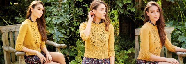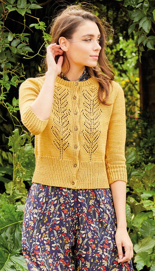 Милый, вязаный спицами жакет на лето Dottie выполнен лицевой гладью и изящным ажуром в виде веточек, украшающих полочки. Этот жакет на пуговицах, с вшивными рукавами длиной ¾ и небольшим круглым вырезом горловины под горло вяжется снизу вверх поворотными рядами из отдельных деталей, которые затем сшиваются вместе. Вырез горловины, манжеты и нижняя планка вяжутся резинкой, которая придает модели завершенность и стиль.