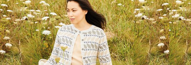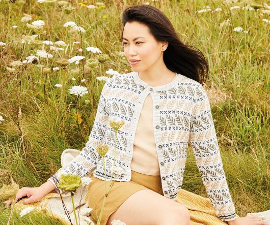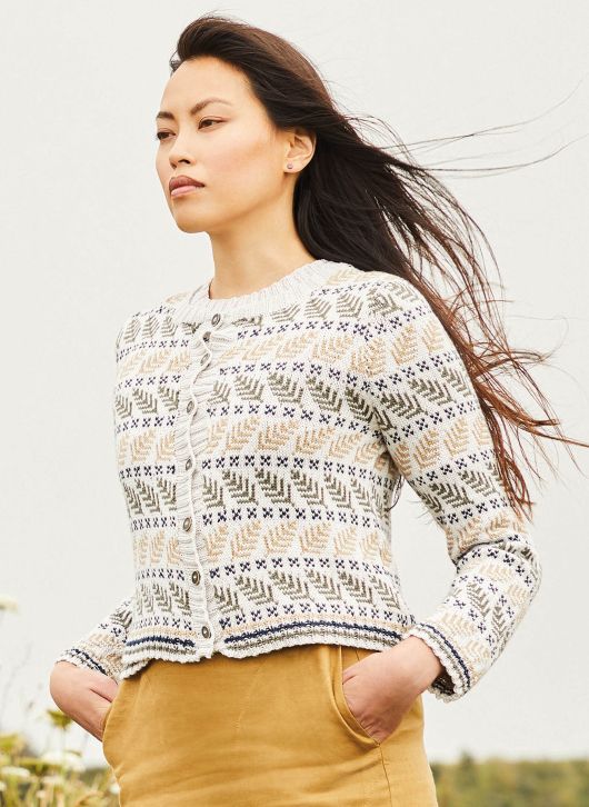Элегантный вязаный жакет Фрида выполнен узорной лицевой гладью в поперечную полоску из хлопковой пряжи 4 пастельных оттенков. Края жакета отделаны одноцветной резинкой. Жаккардовый жакет на пуговицах, небольшим круглым вырезом горловины и длинными вшивными рукавами на манжетах вяжется снизу вверх из отдельных деталей, которые затем сшиваются вместе. Этот жакет - часть комплекта-двойки с топом Diego.
