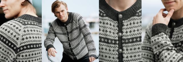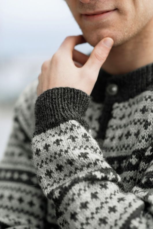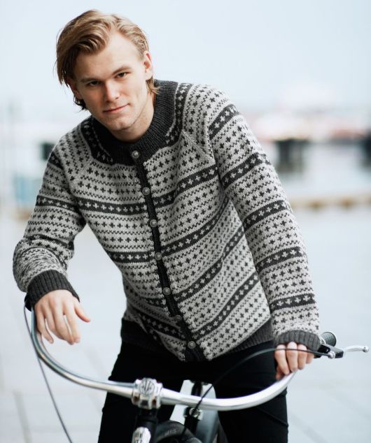 Мужской вязаный жакет Jakke выполнен снизу вверх контрастным жаккардовым узором.