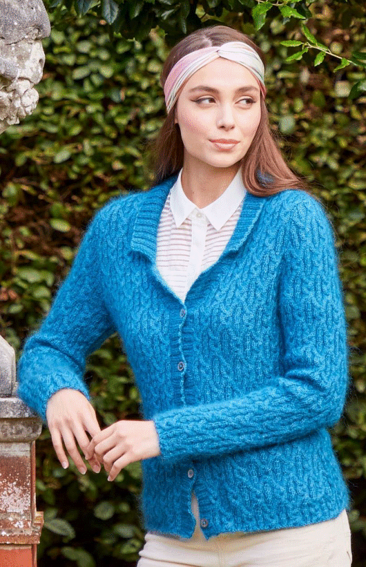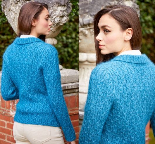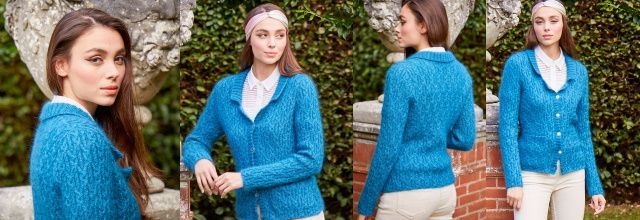 Классический вязаный жакет Patricia полностью выполнен узором из кос. Конструкция вяжется отдельными деталями, которые сшиваются. Небольшой отложной воротник и карманы являются дополнительными деталями комфорта.