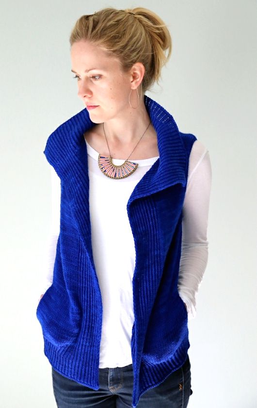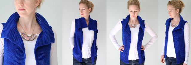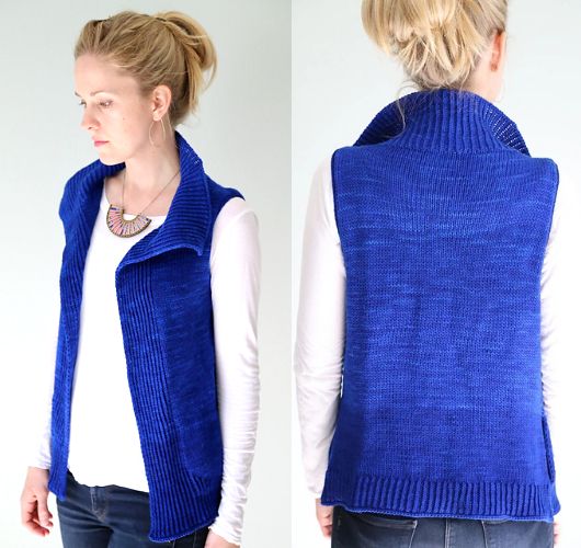 Вязаный жилет Эон выполняется сверху вниз, начиная с воротника. Спинка вяжется вниз от задней части воротника и с дополнительно набранными петлями для плеч. Левая и правая полочки вяжутся вниз от передней половинки воротника и плеч спинки, и вяжутся отдельно до проймы. Затем спинка и полочки вяжутся вместе, разъединяясь во время вязания входов карманы. Подкладки карманов и окантовка проймы, выполняются по завершению вязания жилета.