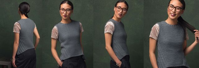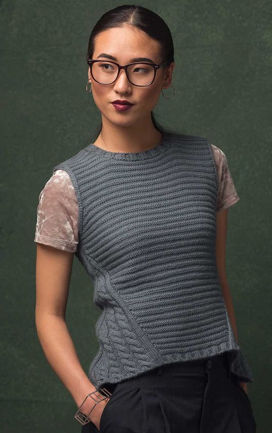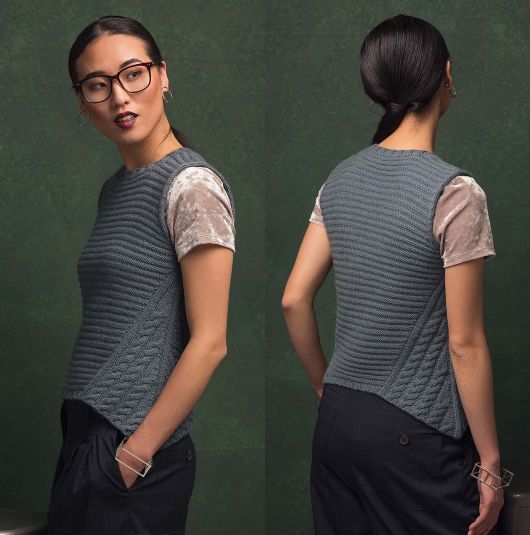 Оригинальный, вязаный спицами жилет Marstrand, с интересным оформлением боковых сторон, вяжется по кругу до проймы, затем перед и спинка вяжутся отдельно прямыми рядами.