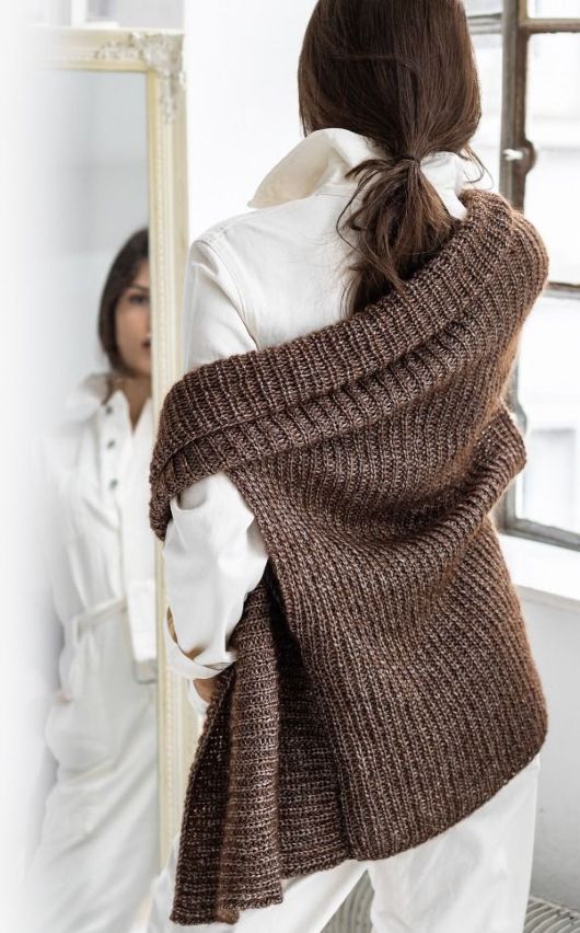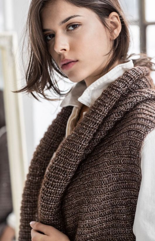 Стильный удлиненный вязаный жилет Mia с объемным воротником выполнен полупатентной резинкой.