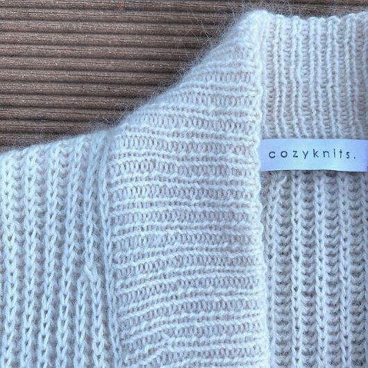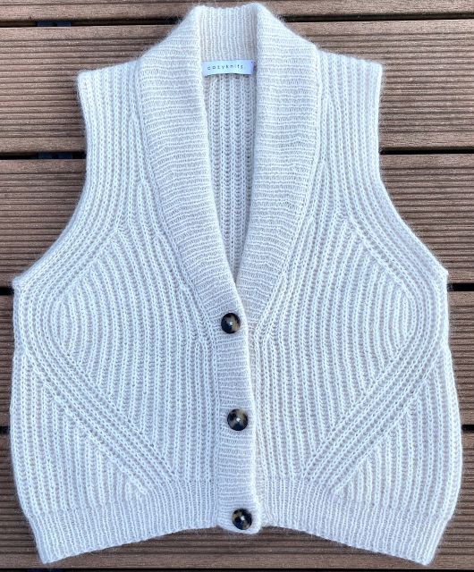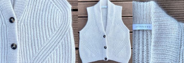 Короткий, современный вязаный жилет PowderVest выполнен резинкой бриошь (английская резинка) с декоративными прибавлениями вдоль боковых швов и проймы. Уютный двухслойный шалевый воротник вяжется укороченными рядами.
