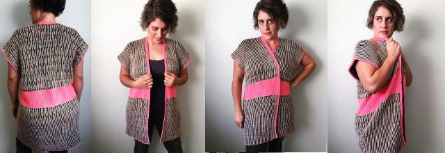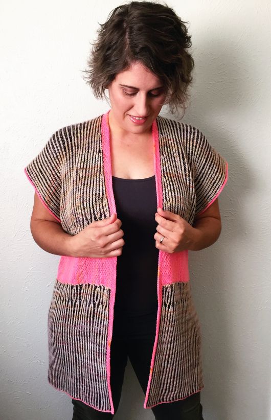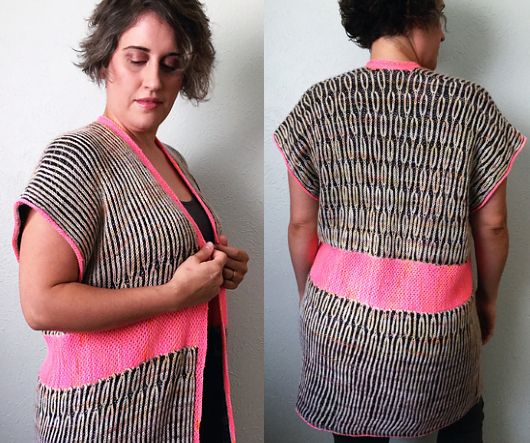 Удлиненный вязаный жилет Primono в стиле модульного кимоно, с акцентом на яркий цвет планки и пояса. Жилет связан в технике двухцветной резинки бриошь.