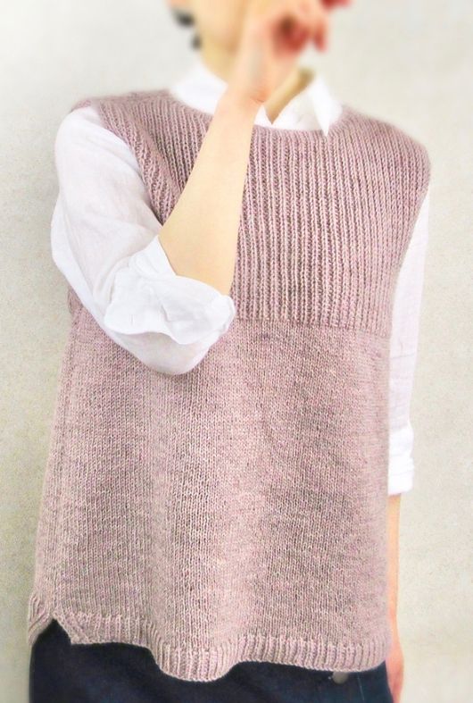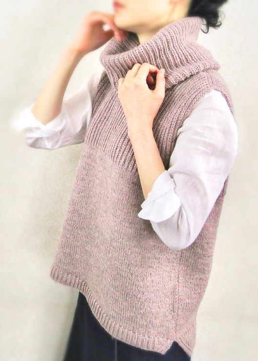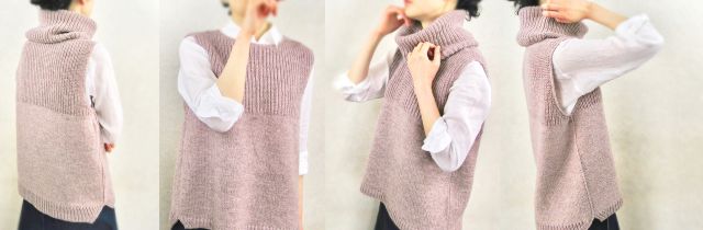 UraUe – свободно прилегающий жилет вязаный без швов сверху вниз. Комбинация узора резинкой HalfFisherman’s и лицевой глади позволяет носить его и наизнанку. Вырез горловины формируется немецкими укороченными рядами и прибавляются петли до ширины плеч. Перед и спинка кокетки вяжутся по отдельности до проймы. Затем соединяются снова и тело жилета вяжется по кругу до нижних боковых разрезов. Нижние планки переда и спинки выполняются поворотными рядами по отдельности. Жилет можно носить с высоким воротником, дополнительно связав коул.