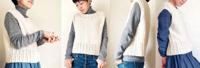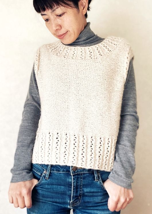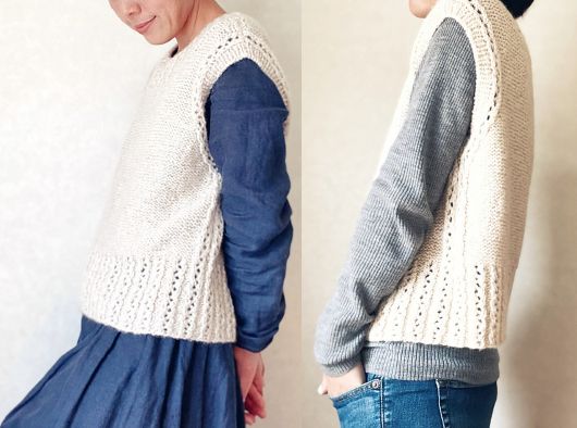 Вязаный жилет Wata выполняется снизу вверх, с ажурным узором по низу и на воротнике. Начиная от ажурной резинки по низу тело вяжут по кругу до подмышек изнаночной гладью с панелями ажурного узора на боковых сторонах. Далее перед отделяют от спинки и каждую часть вяжут туда и обратно, чтобы создать изогнутые проймы рукава, а затем используют немецкий способ укороченных рядов для формирования плеча. После соединения плеч вяжите ажурную резинку на вырезе горловины и поднимайте петли вдоль проймы рукавов, чтобы закончить резинкой.