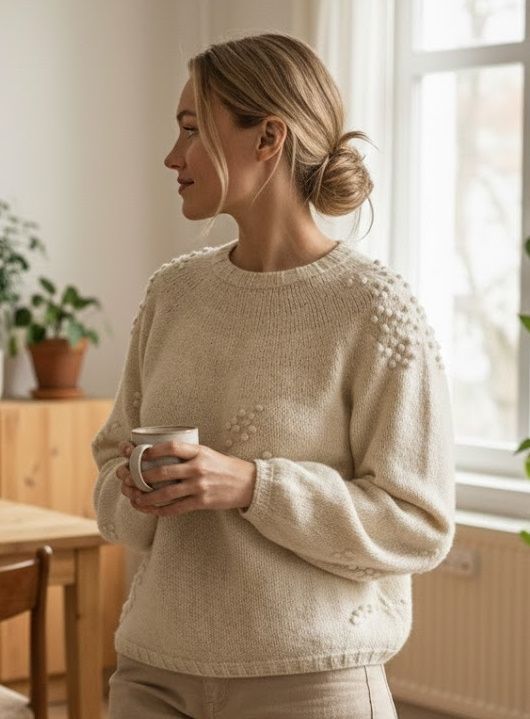 Барашки - это просторный джемпер, который мы вяжем сверху вниз без швов. На протяжении всего джемпера мы будем вязать различные схемы, которые будут создавать текстуры с помощью объемных "барашков" в разных зонах полотна. Сам джемпер будет имитировать пейзаж; а "барашки" в целом — стада, которые по нему бродят. Этот джемпер предлагает вязальщице свободно размещать "барашков" (шишек) там, где ей больше нравится, или следовать схемам выкройки, чтобы воспроизвести дизайн в точности, как он предложен.