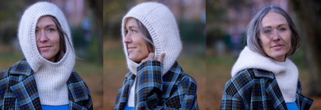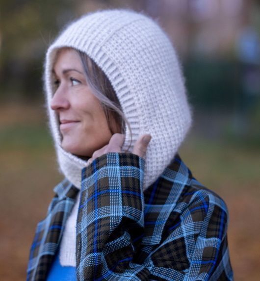 Вязаный капюшон Hilly свободной формы вяжется сверху вниз ломаной резинкой. Сначала вяжется квадрат для верхней части капюшона. Затем поднимаются петли и вяжутся боковые стороны сверху вниз, одновременно на затылочной части капюшона выполняются убавки и прибавки петель. Петли соединяются у подбородка в круг и вязать пока не будут закрыты петли со стороны спинки табулярным методом. Затем продолжать вязать перед поворотными рядами и закрыть петли. В завершении поднимаются петли открытой части и вяжется планка резинкой.
