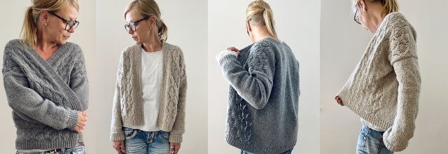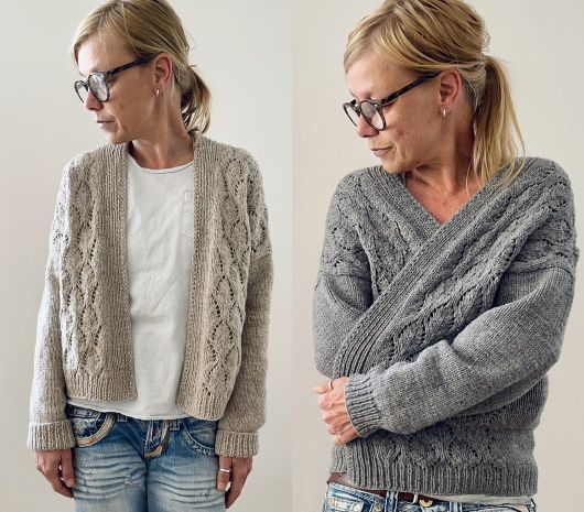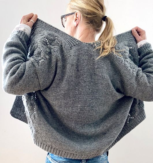 Кардиган Elah вязаный без швов сверху вниз. Полочки вяжут ажурным узором, спинка связана лиц. гладью. Вязание начинают с временного набора петель на плечевых скосах для полочек (сначала вы будете вязать правую полочку, затем левую полочку). Как только вы сформируете плечевые скосы укороч. рядами, полочки вязать прямо до подмышек. Далее поднимают петли по временно набранным петлям плечевых скосов переда и вяжут спинку на ту же длину. Полочки и спинку соединяют на уровне подмышек и вяжут тело сверху-вниз прямыми рядами до нижнего края. Поскольку резинку вяжут одновременно с полочками, отделка не требуется. Для рукавов петли поднимают по краю пройм и вяжут рукава лиц. гладью по кругу до манжет.