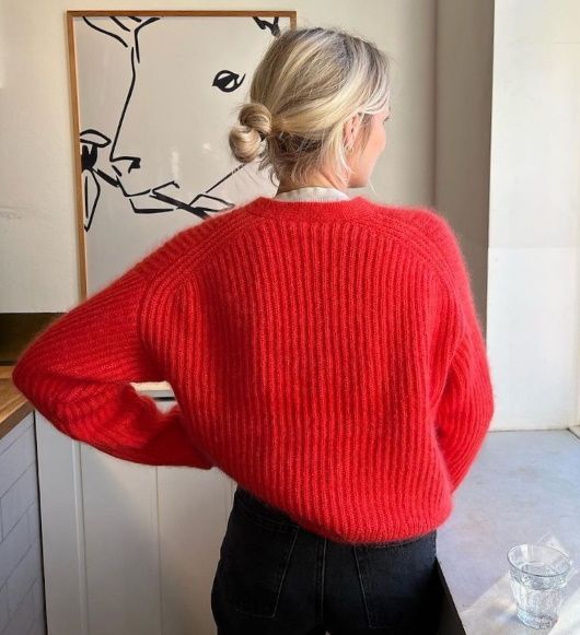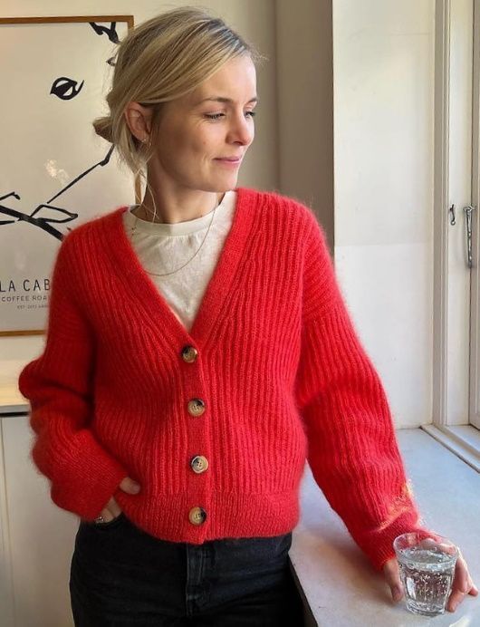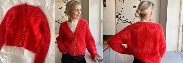 Кардиган Aгнете вяжется сверху вниз бриошь резинкой. Сначала вяжется секция воротника полой вязкой, которая позже образует интегрированные планки для пуговиц. Далее петли поднять по краю этого участка, и из них вяжется кокетка спинки. После этого кокетка правой и левой полочек вяжутся отдельно. Три части кокетки соединяются, образуя тело, которое вяжется прямо одновременно с планками полой вязкой. Затем петли поднимаются вдоль пройм, и рукава вяжутся вниз по кругу.