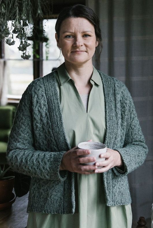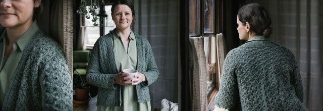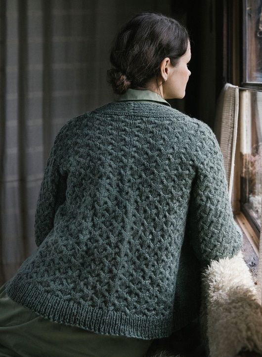 Классический кардиган Alku вязаный сверху вниз. Работу начинают с набора петель для середины горловины спинки и сначала вяжут правое расширение горловины (из стороны в сторону) резинкой до половины длины горловины спинки. После этого набирают петли для правого плеча, и правую кокетку переда вяжут на длину проймы. Петли для левого расширения горловины поднимают по краю набранных петель, и затем вяжут левое расширение горловины. Затем набирают петли для левого плеча переда и левую полочку вяжут на длину проймы, пройму формируют путем прибавок. Для спинки поднимают и провязывают петли по плечевым скосам и горловине спинки и спинку вяжут в соответствии с полочками. Спинку и полочки соединяют, образуя единое полотно. Для рукавов петли поднимают и провязывают по краю проймы. Для вязания большого количества петель используйте круговые спицы.