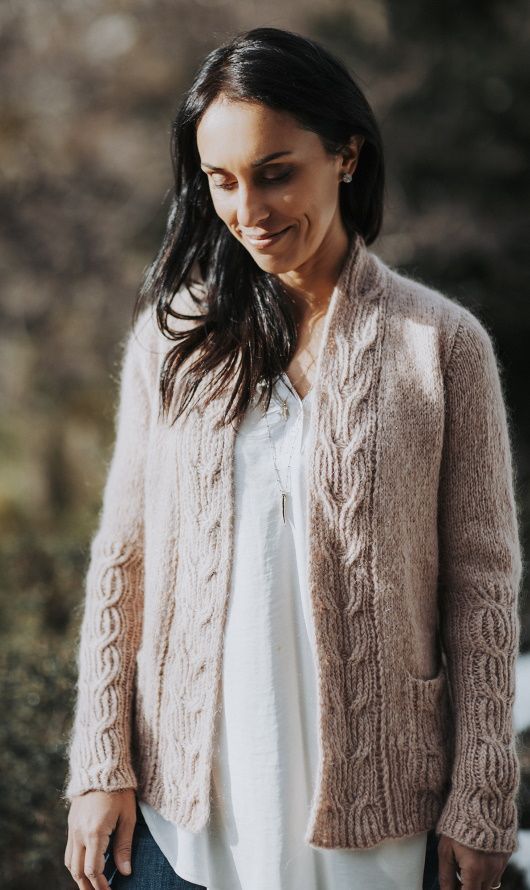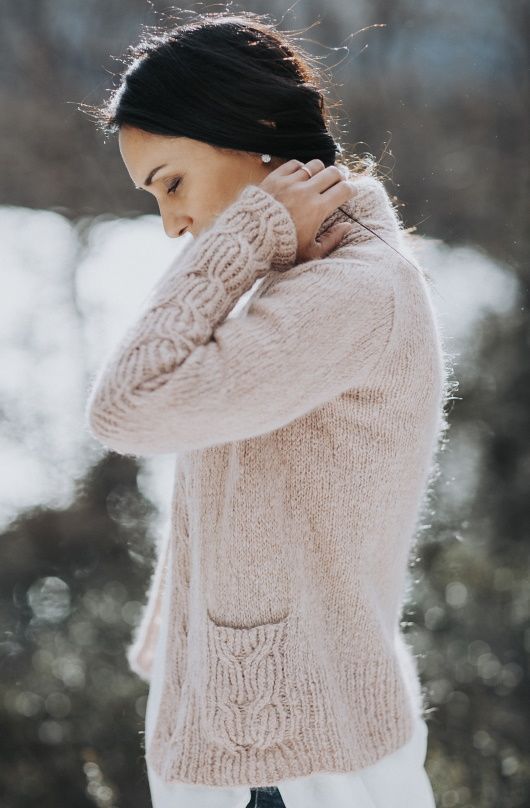 CloudPeak - это уютный бесшовный кардиган, связанный сверху-вниз, украшенный двусторонним шалевым воротником, узором кос на манжетах, и еще одна выдающаяся особенность - карманы. Спинку и перед этого кардигана провязывают одновременно, с использованием небольшой плечевой конструкции в виде погона. Петли для рукавов поднимают в районе подмышек и рукава вяжут по кругу, используя несложные укороченные ряды для придания формы плечу. Карманы умело расположены и скрыты за узорами в виде кос, превращая эту вещь в незаменимый предмет гардероба.