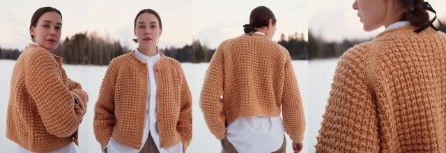 Современный вязаный кардиган Cork с рукавами реглан выполнен сверху вниз рельефным узором. Кардиган связан из мягкой и объемной, слегка крученой пряжи. Кардиган свободного кроя, чтобы под него можно было поддеть более легкую одежду, он также может носиться как жакет осенью и весной. Основной узор повторяется каждые 4 ряда, что позволяет легко его запомнить. Кардиган отделан планками для пуговиц и воротником-стойкой, связанными резинкой. Благодаря конструкции сверху вниз, все длины можно изменять по своему усмотрению.
