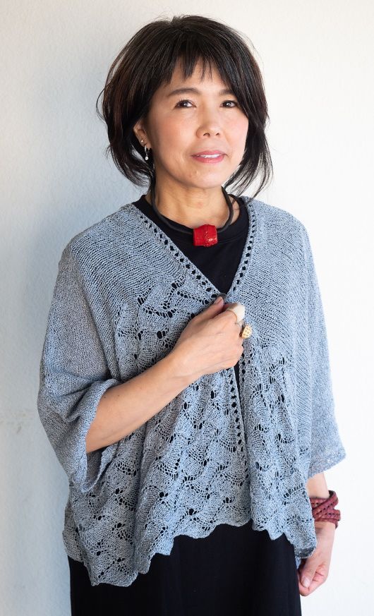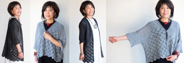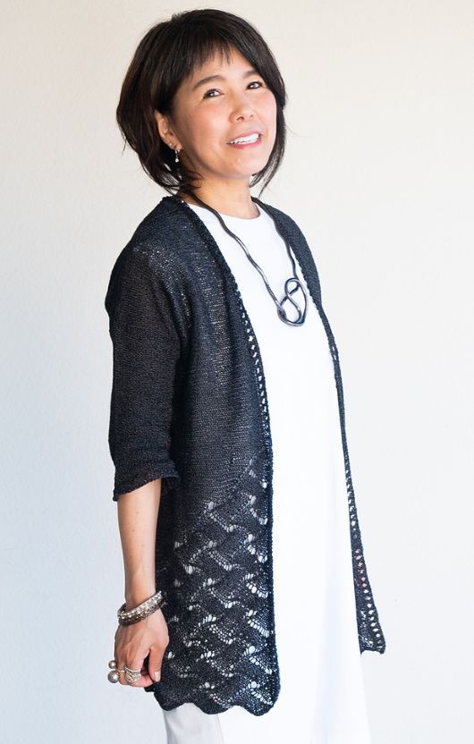 Тело и рукава этого кардигана Crosscurrents связаны без каких либо формирований. Основное полотно представляет собой комбинацию лицевой глади и ажурного узора, который изменяется по ширине, создавая асимметричный вид. Вы можете выбрать для себя разную длину и ширину и кардигана. На фото показаны два кардигана - один с обычной посадкой с большей длиной и другой со свободной посадкой с укороченной длиной. Различные комбинации ширины груди и длины придают изделию совершенно разный вид. Вы можете носить его с закрытыми полочками в застегнутом виде на свое усмотрение.