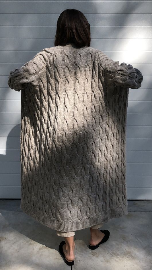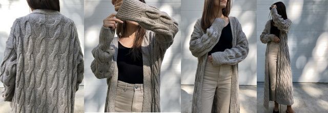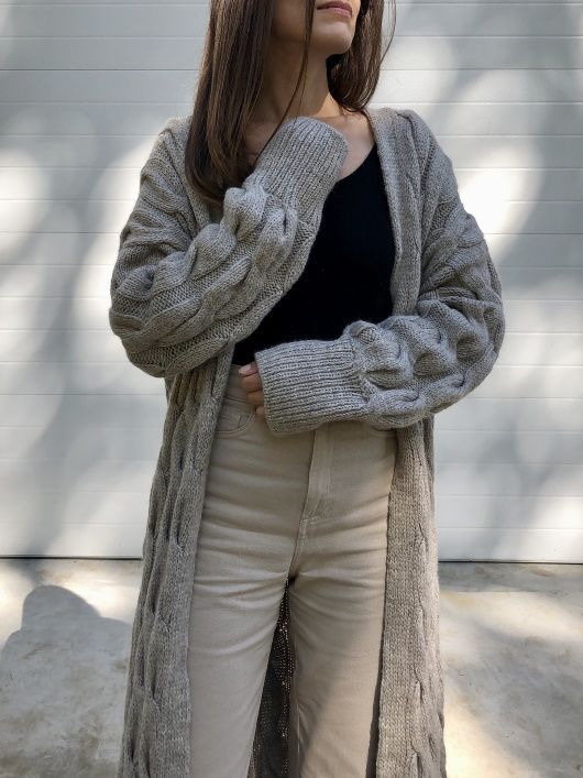 Длинный вязаный кардиган Grayling заменит вам весеннее пальто. Кардиган вяжется вяжется сверху вниз крупными косами. Кокетка спинки выполняются прямыми рядами и формируется прибавками. Левое и правое плечо вяжутся по отдельности прямыми рядами. Спинка и полочки соединяются у основания проймы и тело кардигана вяжется прямыми рядами. По краям проймы поднимаются петли для рукавов и рукава выполняются по кругу до манжет.
