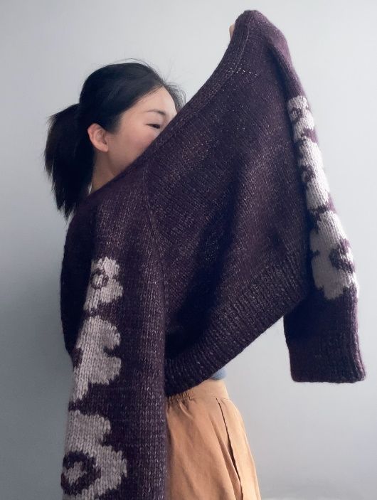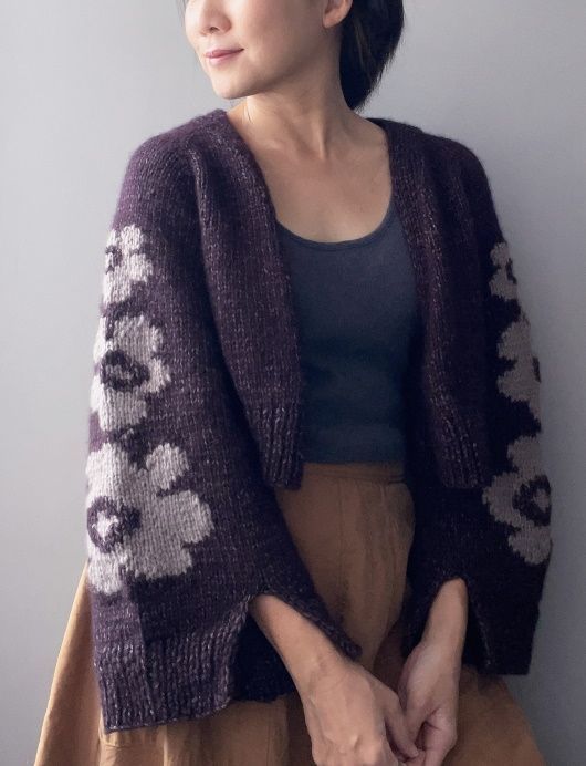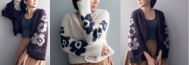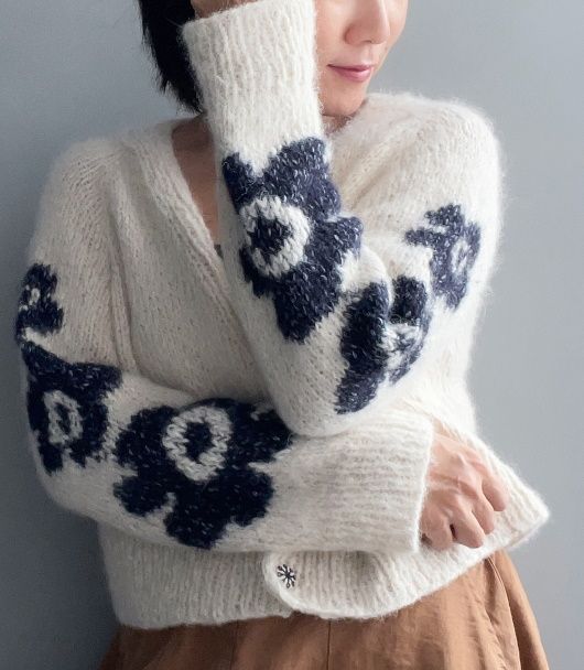 Вязаный кардиган Nola выполнен сверху вниз регланом и украшен крупным цветочным узором на рукавах. Инструкции представлены для обычных и широких рукавов. Вязание начинается с планки горловины спинки кардигана. Петли поднимают по горловине, чтобы приступить к вязанию кокетки с формированием сложного реглана. После того, как рукава и тело будут отделены, тело вяжут до низа. Рукава вяжут прямо до запястья и украшают интарсией. После того, как манжета будет готова, концы интарсии вплетаются внутрь, прежде чем рукав будет сшит от манжеты до подмышки матрасным швом. Узор "интарсия" на каждом рукаве выполнен по схемам.