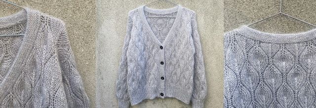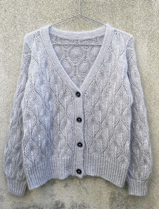 Вязаный кардиган OliveV-neck дизайн демонстрирует ажурный узор и планки связанные резинкой. Кардиган связан без швов пряжей в 1 нить Merino и 2 нити Soft Silk Mohair сложенными вместе, он мягкий, легкий и воздушный – как облако. Кардиган связан с V-образной горловиной. Двойная планка является элегантной отделкой ажурного кардигана. Вязание начинается с двух передних частей и продолжается со спины до пройм. Здесь две детали переда и спинки соединяются на одной спице и далее вяжутся одним полотном поворотными рядами. Петли рукавов подбираются, рукава формируются укороченными рядами, а затем вяжутся по кругу. Широкие планки завершают тело и рукава. Планка для пуговиц в конце вяжется двойной вязкой.