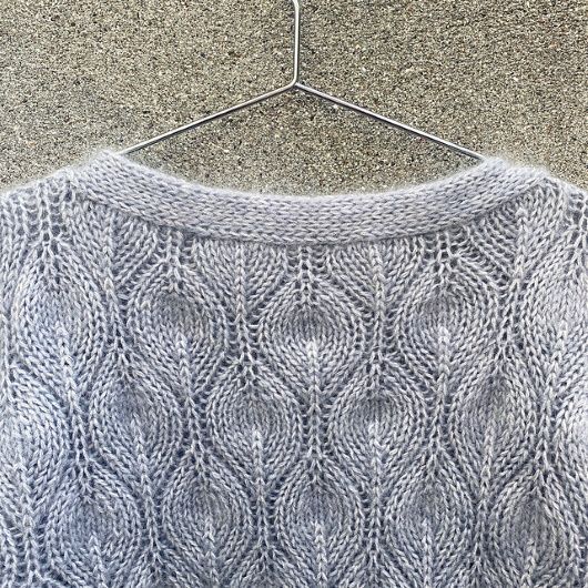 Пряжа: 1 нить Knitting for Olive Merino (250 м [273 ярд.] / 50 г [1.8 oz]), тонкой пряжи, 4 (5, 5, 5, 5, 6, 6, 6) мотков + 2 нити Knitting for Olive Soft Silk Mohair (225 м [246 ярд.] / 25 г [0.9 oz]), пряжа для ажура, 9 (9, 10, 10, 11, 11, 12, 12) мотков. Образец связан из Merino, Pearl Grey + Soft Silk Mohair, Soft Blue Спицы: 4.5 мм / US7, 5 мм / US8 и 5.5 (6, 6.5, 6, 6.5, 6, 6.5, 6) мм / US9 (10, 10.5, 10, 10.5, 10, 10.5,