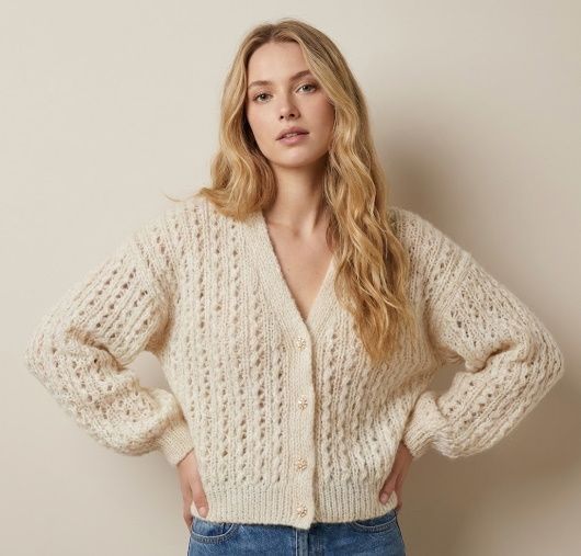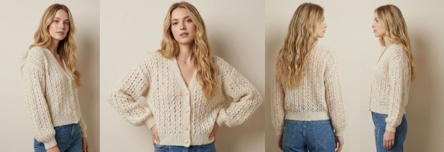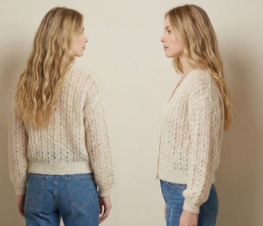 Воздушный ажурный вязаный кардиган Snow выполняется сверху вниз. После того как связаны основная часть и рукава, отдельно вяжется планка с пуговицами/петлями и затем пришивается к основной части. Рукава вяжутся по кругу. Резинки (1x1) на манжетах закрываются трубчатым (итальянским) закрытием и вяжутся спицами 3.5 мм. Петли для пуговиц делаются в конце.