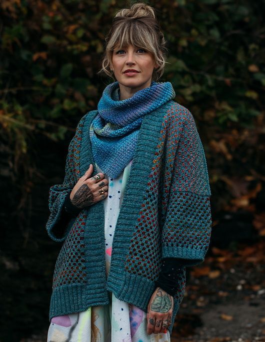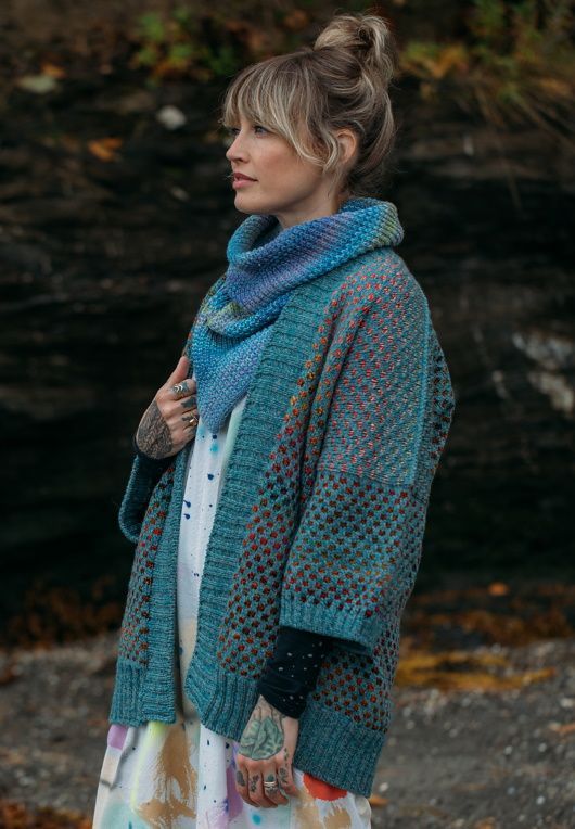 Trinigan - это вязаный кардиган в пиджачном стиле, который можно надевать поверх чего угодно, с широкими рукавами и легким открытым фасоном. Свяжите его модным - с мраморным фоном и мозаичным узором, меняющим цвет!
