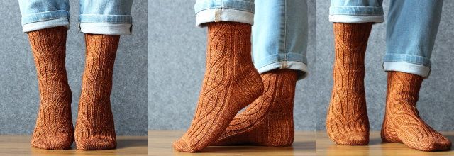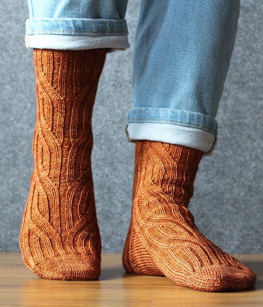 Вязаный носки CoralReef с привлекающим взгляд смещающимся узором резинкой, который имитирует переплетающиеся косы, но на самом деле вяжется с простым и продуманным размещением прибавок и убавок петель.