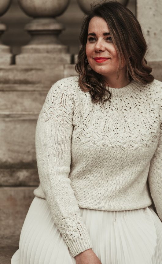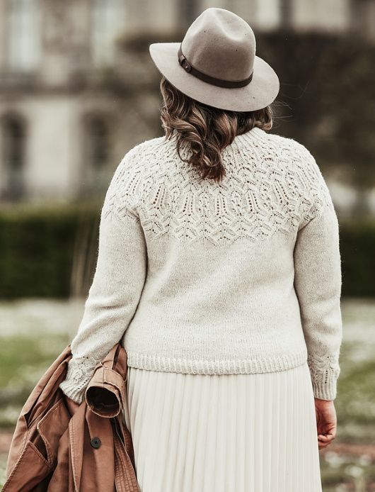Пуловер Calliope вязаный без швов сверху-вниз, начиная от планки горловины. Кокетка и манжеты украшены прекрасным ажурным узором. Рукава отделяют от тела на уровне подмышек и вяжут по отдельности. Спинку формируют укороченными рядами для лучшей посадки по фигуре.