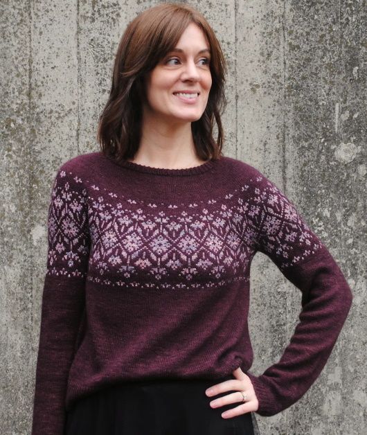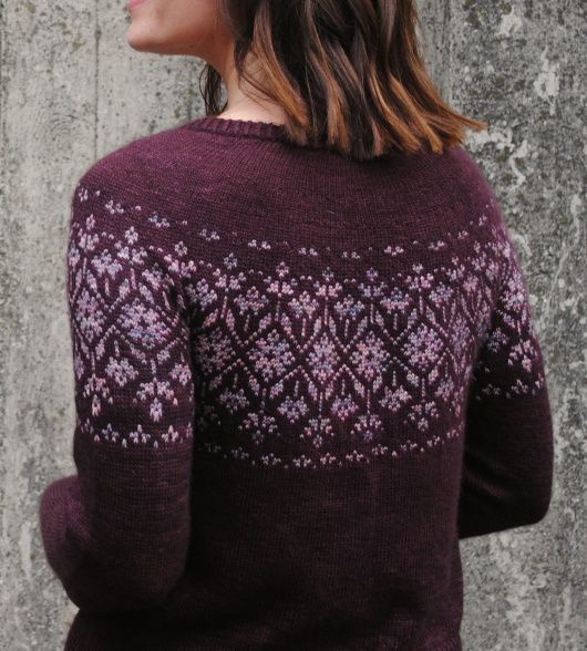 Пуловер DaysOfBeauty связан сверху вниз по кругу. После того как будет связана планка горловины, начинают формирование немецкими укороченными рядами для оптимальной посадки изделия. Кокетка украшена красивым цветным узором. Как только кокетка будет закончена, петли отделяют на тело и рукава, которые вяжут по отдельности по кругу.