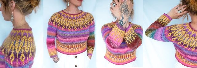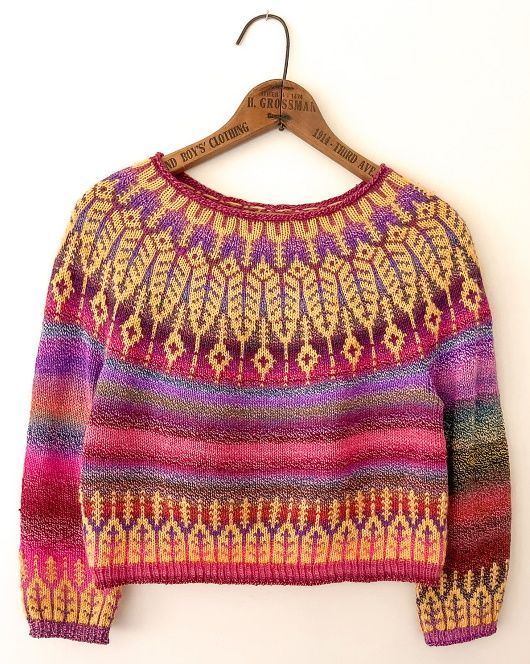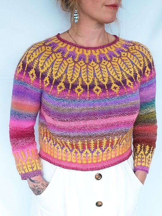 Яркий вязаный пуловер KoivulaLight выполнен по кругу сверху вниз и украшен цветным узором на кокетке и подоле.