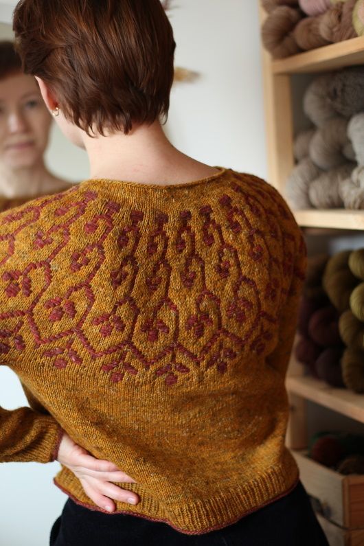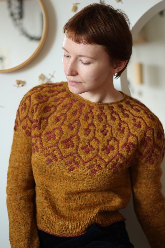 Вязаный пуловер Nivalis выполнен сверху вниз по кругу и украшен цветочным узором на кокетке. Цветной узор может быть выполнен как обычным простым способом или как более сложным узором из «поплавков». Чтобы максимально приблизиться к идеально й посадке, описание представлено в 18 размерах!