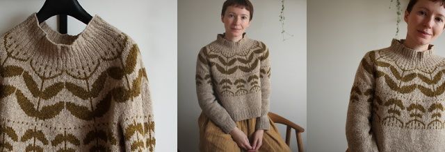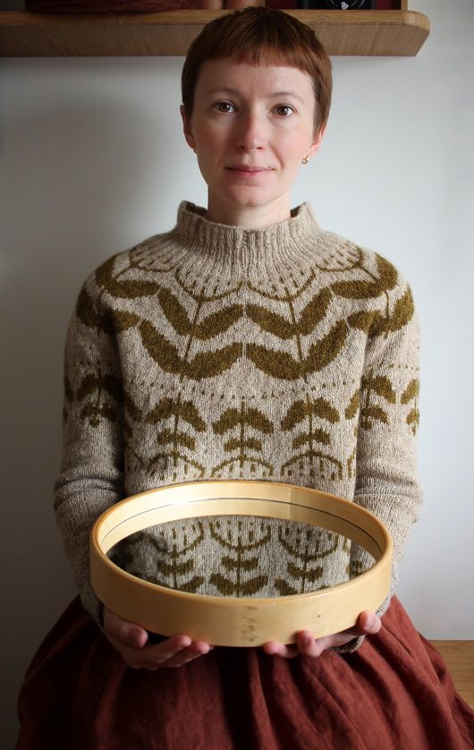 Вязаный пуловер Polina выполняется по кругу сверху вниз. Кокетку украшает крупный цветочный узором в ботаническом стиле. Тело и рукава связано узором поменьше. В описании приведены три варианта горловины: имитация с оборками (как показано на фото), горловина, сложенная вдвое и обычный круглый вырез.