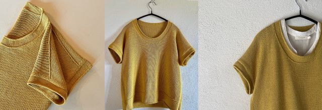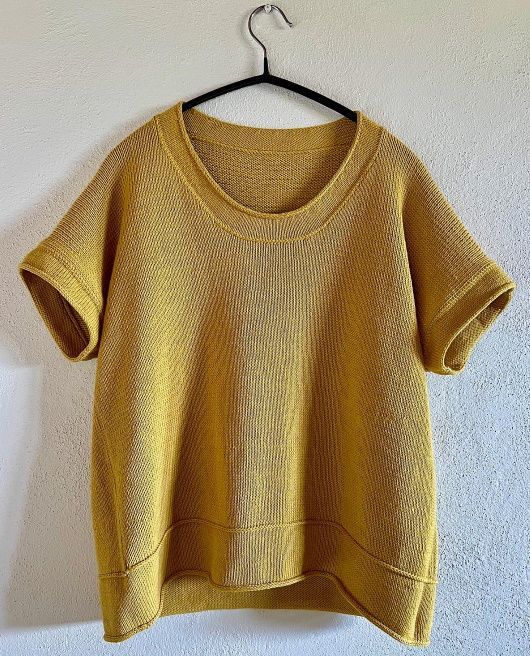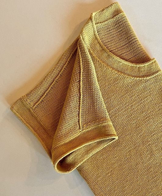 Летний пуловер RawTee вязаный сверху вниз лицевой гладью. Сначала выполняется спинка с формированием плеч укороченными рядами. Затем вяжется перед, петли для которого поднимаются по наборному ряду петель спинки. Под проймой петли спинки и переда соединяются и тело вяжется по кругу.