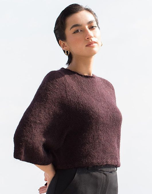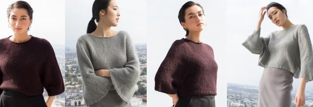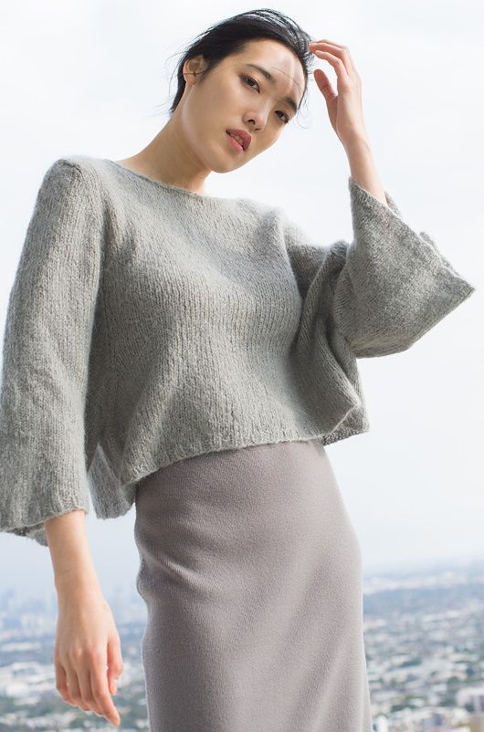 Тонкий вязаный пуловер Risom с рукавами колокол выполнен по кругу снизу вверх. Сначала пуловер вяжется по кругу до проймы, затем перед и спинку вяжут отдельно до плечевых скосов. Рукава вяжут по кругу до оката, затем выполняется окат прямыми и обратными рядами. Выбирайте размер с прибавкой на свободное облегание 6–14”.