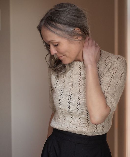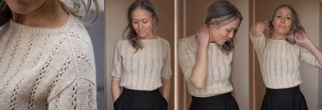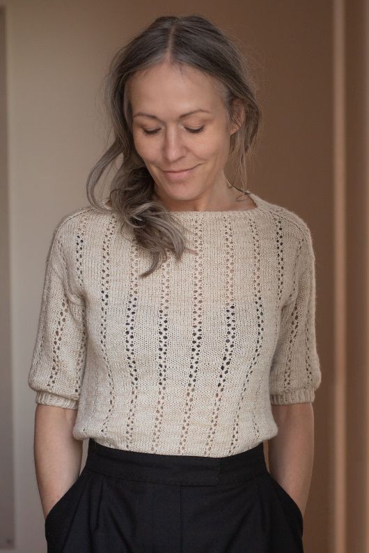 Пуловер ShoreTee вязаный простым и изящным ажурным узором. Модель выполняется сверху вниз. Сначала по кругу вяжется край горловины и верхняя часть кокетки. Затем кокетка делится на перед и спинку, и каждая часть вяжется поворотными рядами до низа проймы. Задняя часть вяжется длиннее передней, чтобы выдвинуть линию плеч вперед и обеспечить удобную посадку. Затем тело вяжется сверху вниз до края.