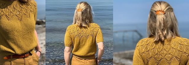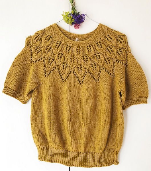 Вязаный пуловер SommerElla выполняется сверху вниз от горловины (после кромки), чтобы свитер облегал фигуру. Очень изящную кокетку с узором в виде листьев связать совсем несложно, как кажется на первый взгляд.. Форма пуловера укороченная и слегка просторная.
