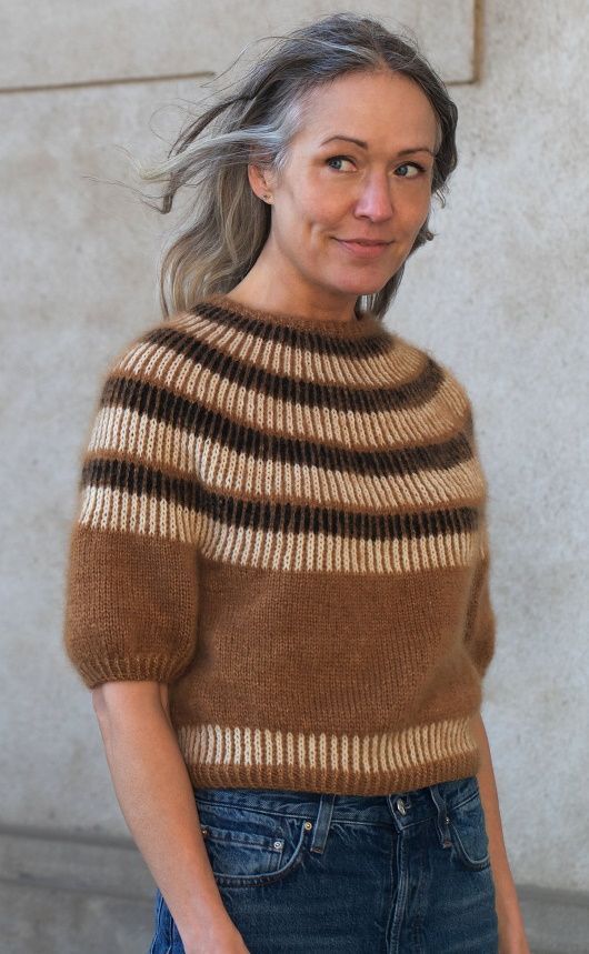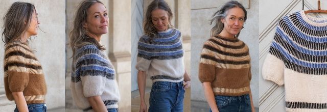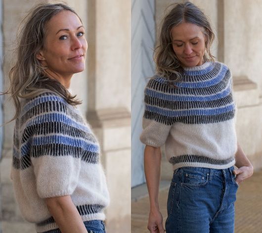 Вязаный пуловер Tanne с короткими рукавами выполнен сверху вниз. Горловина набирается итальянским набором петель и вяжется и вяжется скрещенной резинкой и далее вяжется круглая кокетка с цветным узором. Укороченные ряды вяжутся перед разделением петель тела и рукавов для создания хорошей посадки. Жаккардовый узор выполняется только с лицевой стороны и не составит труда выполнить его даже для начинающей вязальщицы.