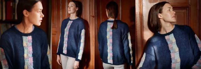 Vespera – это легкий и воздушный пуловер, в котором смешаны разные типы и толщины пряжи. Контрастные пряжи используются для вязания абстрактных блоков узора в центре переда, спинки и рукавов, выполненных методом интарсии. Узоры интарсии – это отличная возможность поэкспериментировать с различными комбинациями пряжи, особенно из ваших запасов. Добавьте этот пуловер в свой гардероб, надевая ее поверх платьев или топов с принтом, чтобы создать эффект многослойного узора.