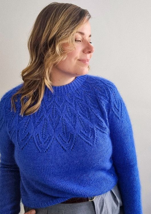 Пуловер Wood Anemone связан сверху-вниз без швов, начиная с планки горловины. Кокетка украшена прекрасным ажурным узором (с дополнительными шишечками, которые вы можете пропустить, если они вам не нравятся). Тело и рукава отделяют на уровне подмышек и вяжут их по отдельности. Спинку формируют укороченными рядами для лучшей посадки по фигуре. Модель слегка укорочена, поэтому идеально сочетается с платьем, юбкой или брюками с завышенной талией, но длину легко изменить для более удлиненной посадки. Обратите внимание, что изменение длины тела повлияет на количество пряжи, необходимое для вязания пуловера, поэтому, если вы хотите, чтобы тело было длиннее, убедитесь, что у вас есть несколько дополнительных мотков пряжи.