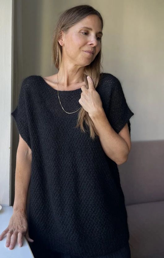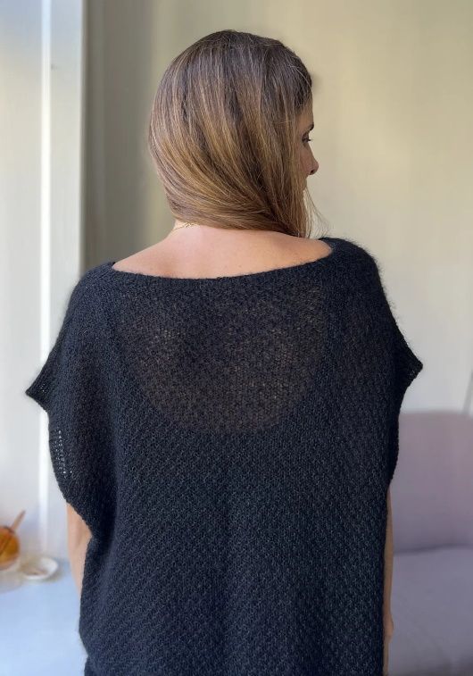 Слиповер на фото связан одной нитью Trio 1 цвета Ink и одной нитью Silk Mohair цвета 30. Обе пряжи от Isager Yarn. Такая комбинация придает узору "двойной мох" воздушность.